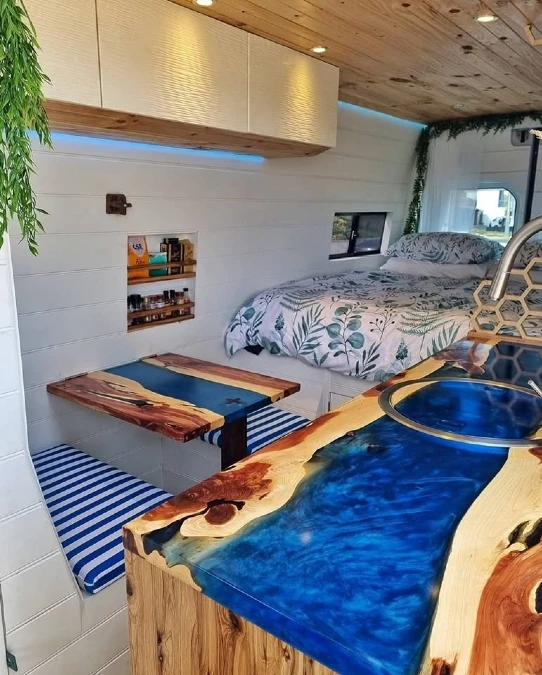 Vibrant blue resin flows through the live edge wooden counters to create a stunning water effect. Striped blue and white cushions on the dining benches match the coastal theme.