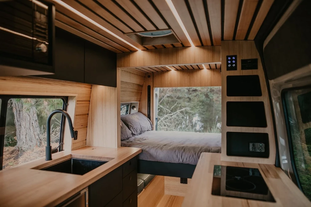 A warm wooden ceiling and matching countertops bring a cabin feel to this mobile space. Thick blankets and plush pillows rest on the bed under a canopy of soft fairy lights.