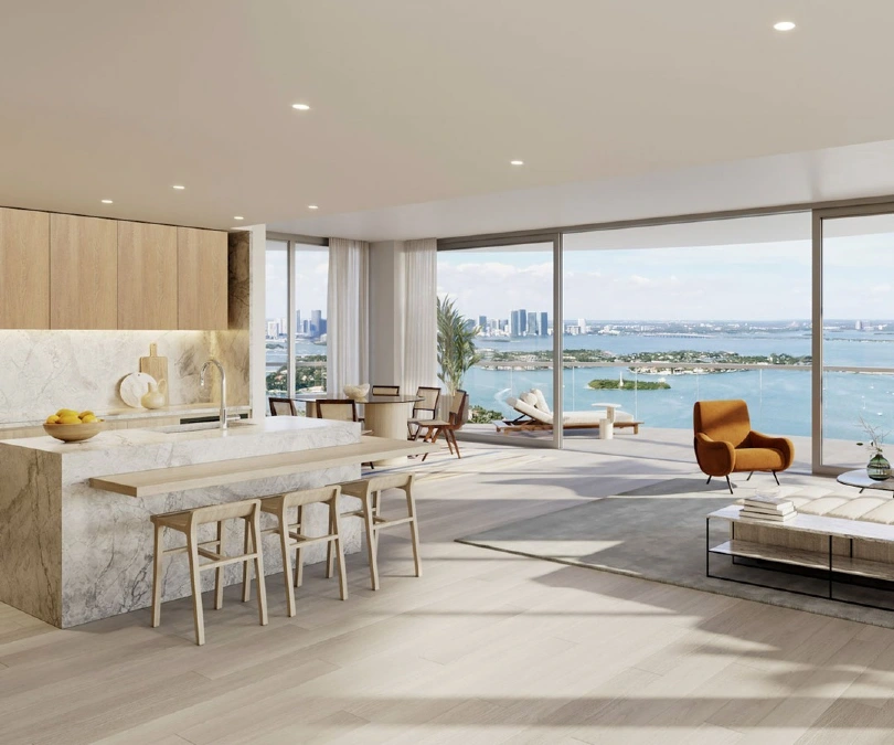 Floor to ceiling glass walls merge the kitchen and living area with a stunning balcony view. This expansive boundary eliminates solid walls while keeping the layout organized.