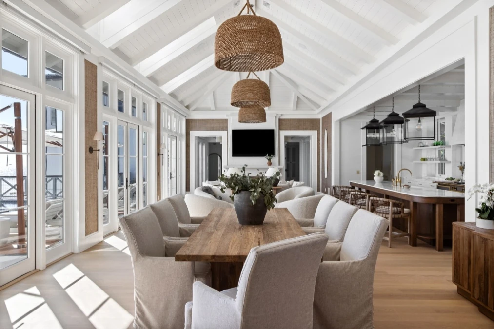 Large rattan light fixtures hang in a row to anchor the dining table. These natural textures contrast beautifully against the crisp white vaulted ceiling.