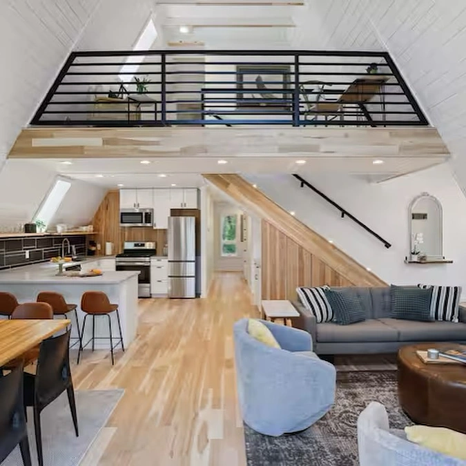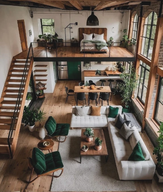 Wooden stairs with thin black railings guide you to the upper level. This smart layout maximizes the high ceilings of a compact industrial space.