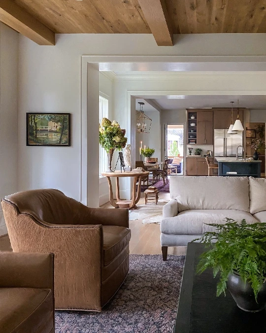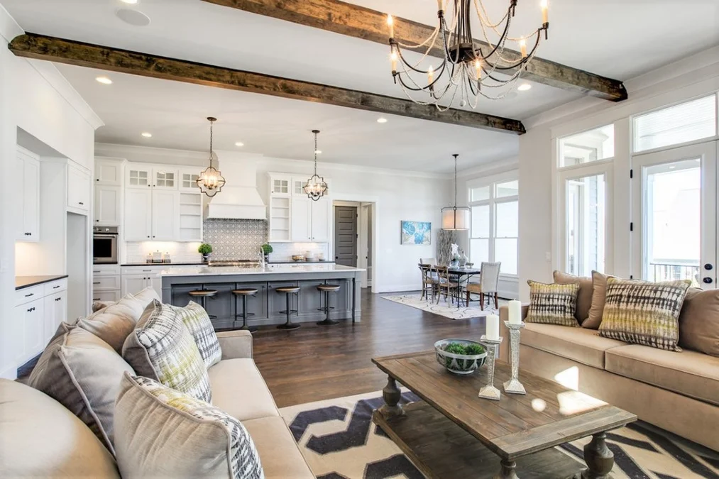 Dark wooden beams stretch across the white ceiling to add architectural interest and scale. These horizontal lines guide the eye toward the kitchen while visually lowering the high ceiling for a cozier feel.