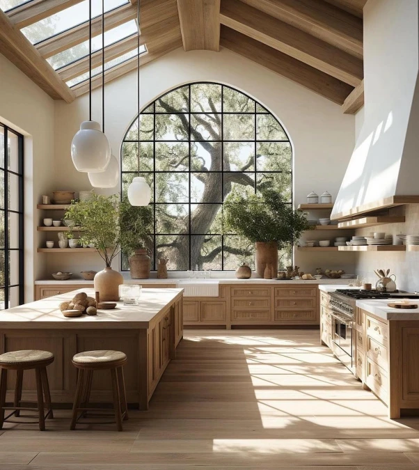 A massive arched window acts as a natural focal point for the kitchen area. This architectural feature frames the outdoor scenery and floods the room with soft light.
