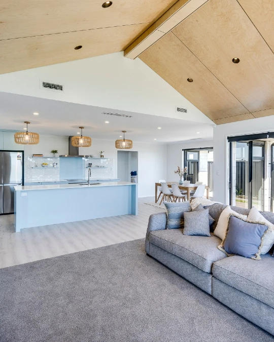 Plywood ceiling panels slope downward to further define the living zone. Recessed lights and cage pendants provide targeted illumination for each specific area.