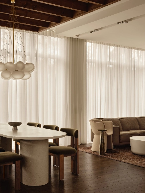 Sheer white curtains span the entire length of the back wall to unify the dining and living zones. These soft drapes provide a consistent backdrop that makes the large room feel cohesive.