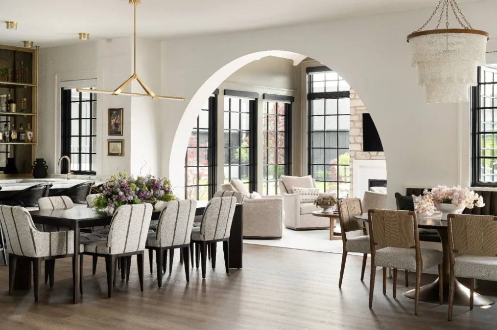 A wide curved archway serves as a grand portal between the dining hall and the sunlit lounge. This structural feature creates a psychological boundary that divides the home without using doors.