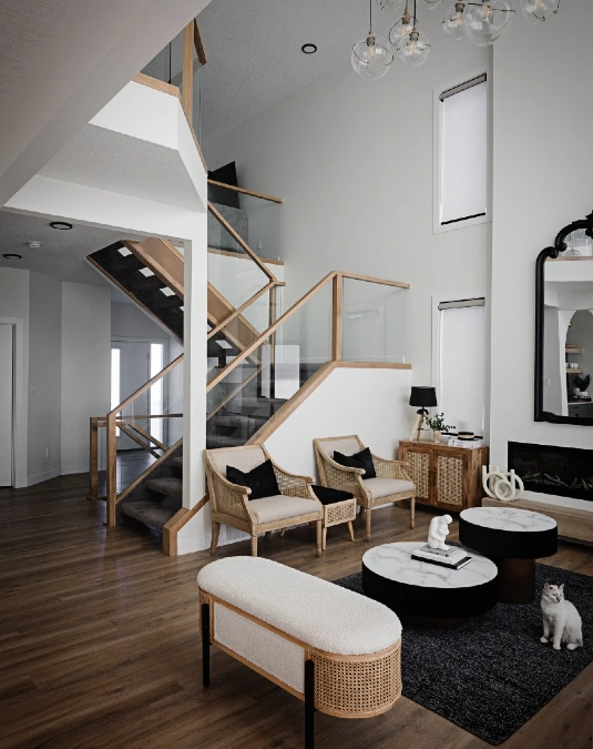 Natural wood handrails add a warm touch to the minimalist design. This choice allows light to travel freely through the different levels of the home.