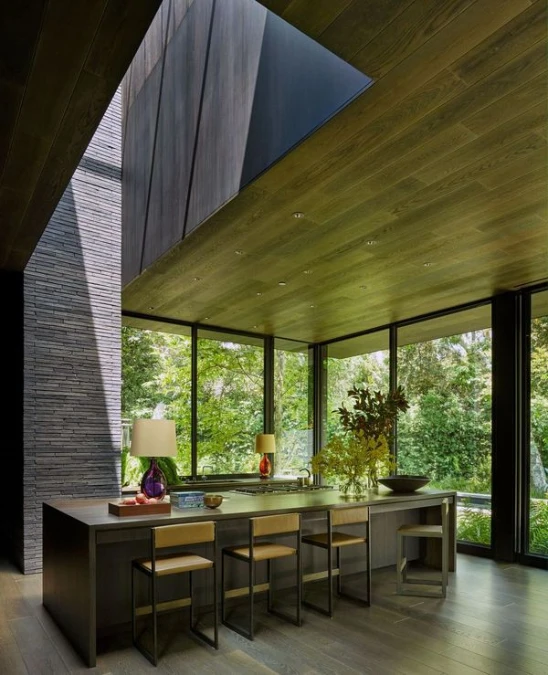Stacked dark gray stone walls provide a heavy texture that contrasts with the glass windows. This material choice builds a solid corner for the kitchen to feel like a private nook within the open layout.