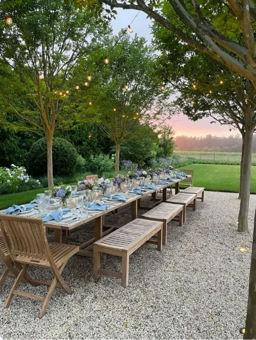 Blue napkins rest on white plates at each individual place setting. Clear glasses catch the light from the setting sun in the distance. Lush green trees border the dining area to create a private feel. This setup works well for a summer evening spent outdoors