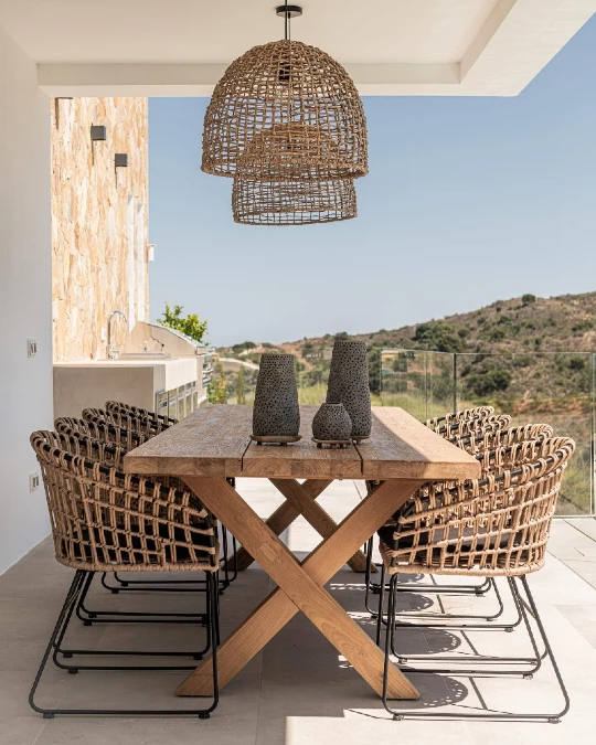 Natural textures define this covered patio space overlooking a scenic valley. A chunky wooden table with X-shaped legs stands as the central focal point. Woven chairs with black cushions offer a stylish place for guests to sit.