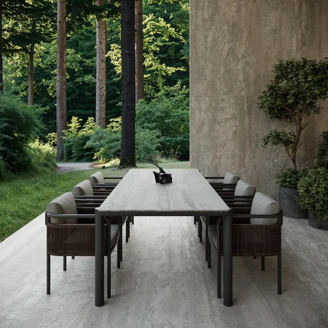 A long marble dining table stands on a matching stone patio at the edge of a lush forest. Dark metal chairs with woven details and grey cushions provide sleek seating for eight people.