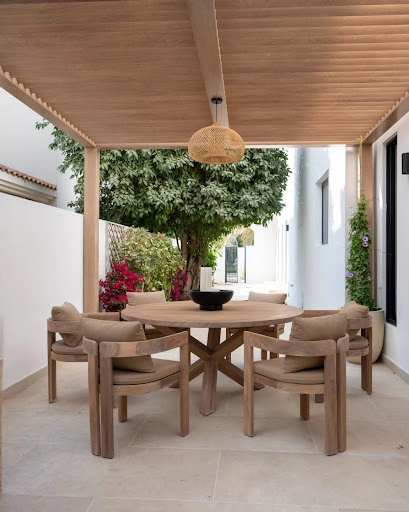 A round light wood table serves as the heart of this minimalist outdoor dining area. Six curved wooden chairs with tan cushions provide comfortable seating for guests. A single woven pendant light hangs from the slatted ceiling to illuminate the table.