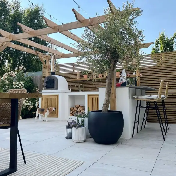 A white outdoor pizza oven stands as the functional centerpiece of this modern patio. Slatted wooden fences provide privacy while allowing light to filter through the garden. Tall bar stools with striped cushions sit at a raised counter for casual snacking.