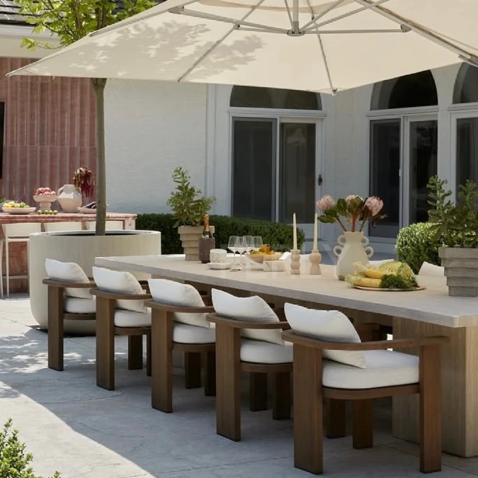 A massive stone table stretches across this sun-drenched patio to accommodate ten guests. Dark wood chairs with plush white cushions line the sides for a clean and high-contrast look.