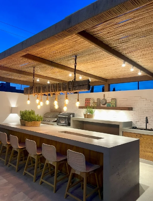 A thick bamboo reed ceiling provides a tropical texture to this expansive outdoor bar area. A heavy wooden beam hangs from iron chains and features light bulbs wrapped in thick rope. Modern grey bar stools with woven backs line the long concrete countertop. This island offers plenty of space for guests to gather during a evening BBQ party.