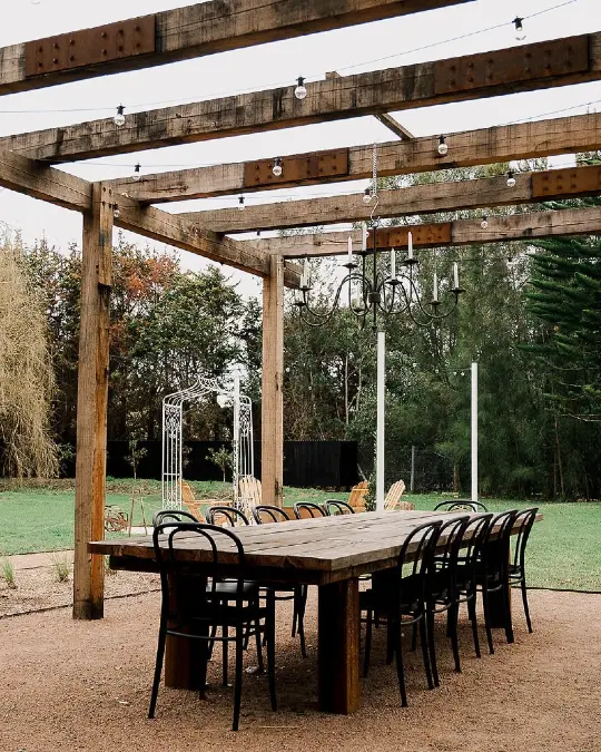 Large wooden beams with exposed metal bolts form a sturdy industrial pergola over this gravel dining area. A wrought iron chandelier hangs in the center to create a striking focal point for evening parties.