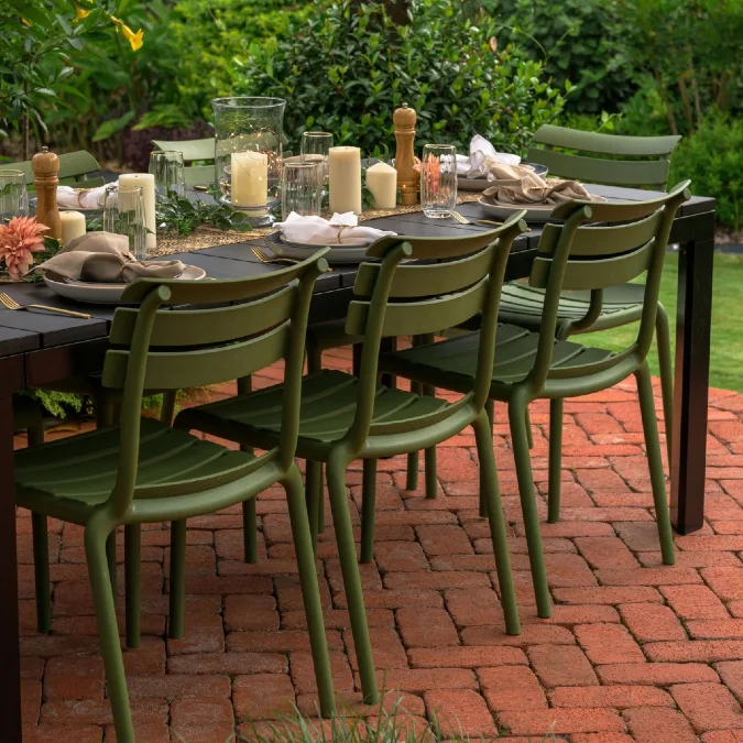 Sleek sage green metal chairs bring a pop of color to this traditional red brick patio. The slatted design of the seating offers a modern contrast to the rustic herringbone ground pattern.