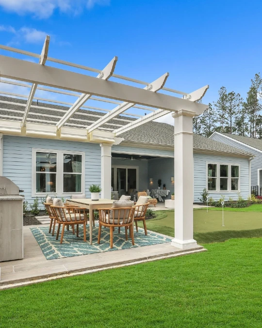 A professional putting green sits just steps away from the dining area for guest entertainment. The light blue siding of the home complements the cool tones of the outdoor decor.