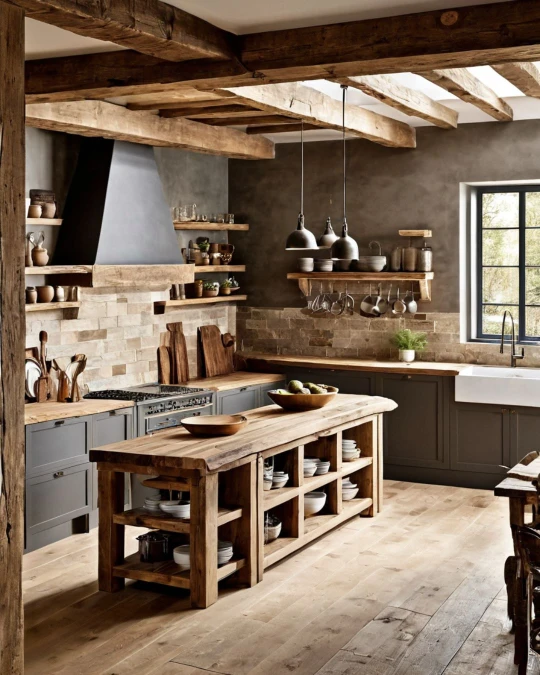 Heavy timber beams draw the eye upward in this kitchen. They add immediate character and warmth to the space. The natural wood tones contrast sharply with the dark grey walls and range hood.