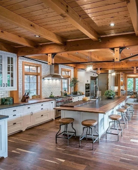 Massive timber beams dominate the ceiling in this spacious kitchen. The natural wood tones bring warmth to the crisp white room. Black metal hardware connects the trusses for an industrial look. This structural feature draws the eye upward immediately.