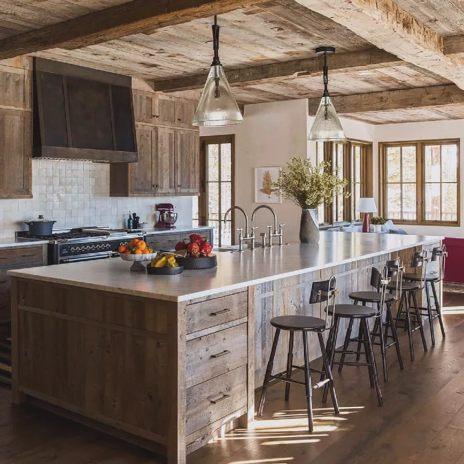 Rough timber planks face the large kitchen island in this space. This weathered texture adds character to the smooth white countertop. Black industrial stools line the seating side for guests. The mix creates a relaxed dining spot.