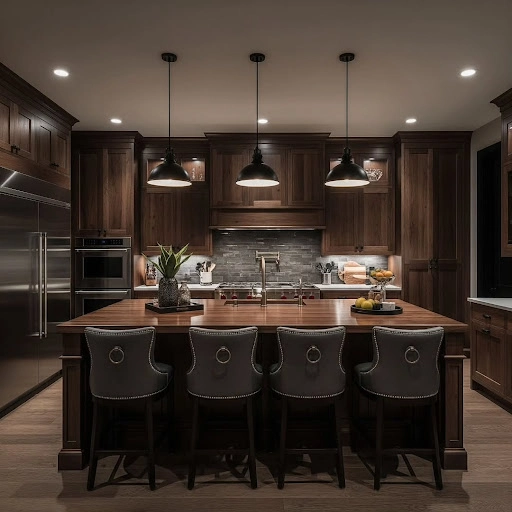 Rich walnut cupboards wrap around the room for a moody look. The dark wood grain adds warmth and depth to the space. Three black dome lights hang in a row above the island. Soft light glows from under the upper shelves to highlight the grey tiles.