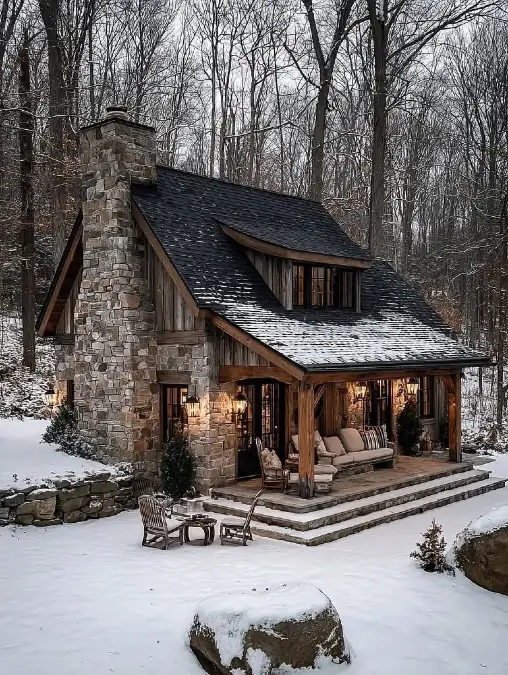 An inviting porch offers shelter with thick wooden posts. Soft amber lights illuminate the comfortable outdoor sofa and chairs. Stone steps lead down to a snowy yard filled with trees.