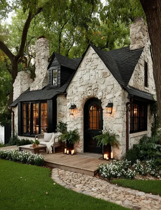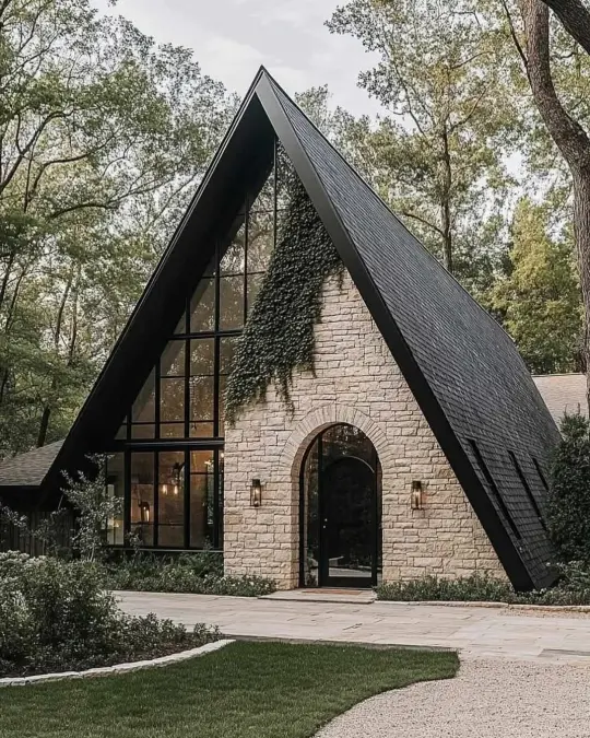 Light-colored, irregular stone blocks finish the exterior walls. Steep black gabled roofs create a striking contrast against the textured masonry. Dark trim frames the large multi-pane windows and the arched entryway door.