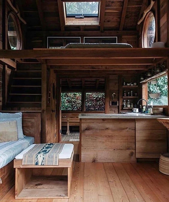 Dark wood planks cover the walls and ceiling completely. A sleeping area sits high above the main floor space. Light enters through the roof window and the round glass porthole.