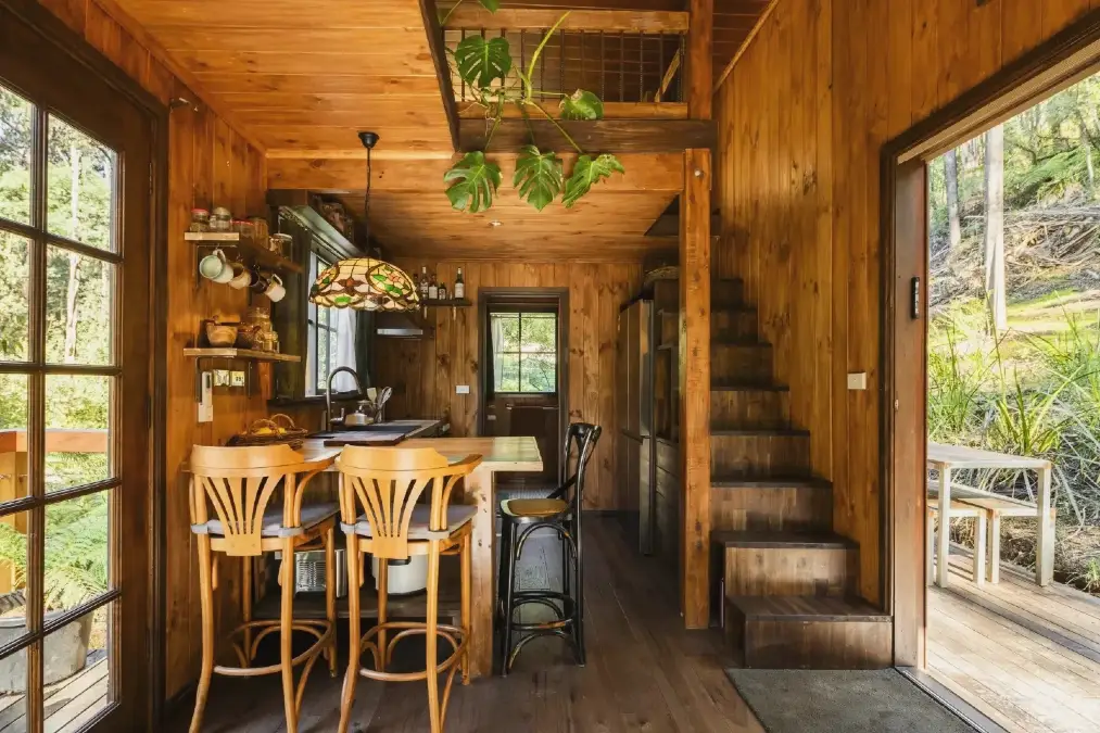 Large glass doors open up to a forest view and let in fresh air. Wooden bar stools sit ready for a morning meal. Solid stairs climb to the upper level near the kitchen.