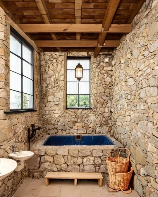 Rough stone walls wrap around the entire bathroom space. A deep blue bathtub adds a bold color to the earth tones. Natural light enters through the large black grid windows.