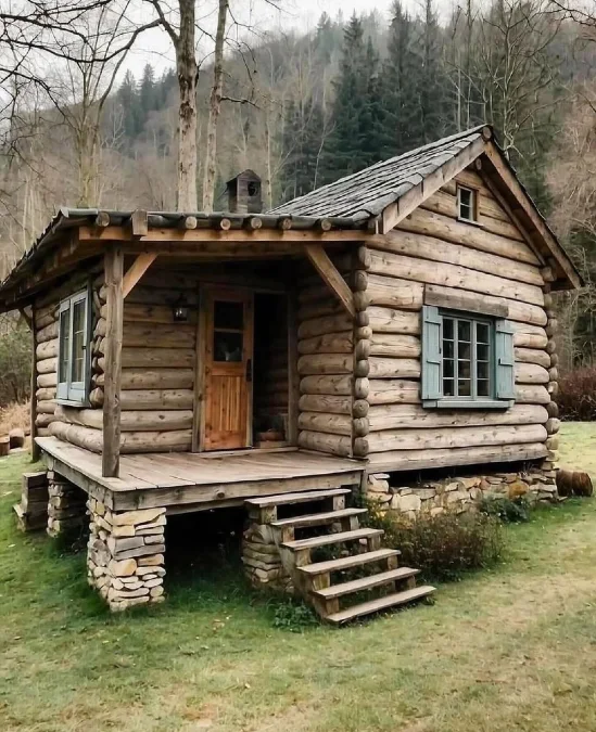 Wooden stairs climb up to the covered entry porch. Blue shutters frame the windows and add a cool tone to the wood. Tall trees stand behind the cabin in the woods.