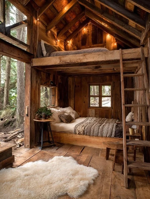 Huge trees stand just outside the large glass wall opening. Chunky knit blankets cover the cozy bed nook below. A white fur rug softens the rustic plank flooring.