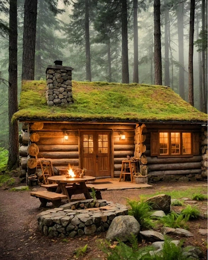 Thick green moss carpets the entire roof surface. Round timber logs stack up to create the sturdy walls. A stone chimney rises above the living green top.