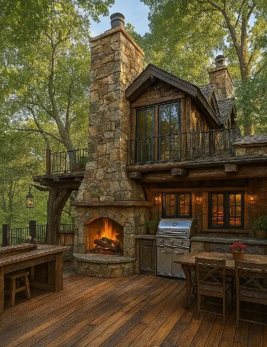 Metal appliances fit neatly into the stone counter for cooking. Two timber tables offer plenty of dining space near the woods. Balconies overlook the patio from the upper level of the house.