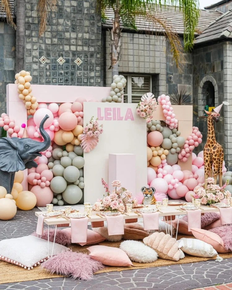Who says jungle themes strictly require traditional khaki or deep forest greens? Soft pastel balloons in dusty rose and sage build a dreamy backdrop, honestly transforming a plain patio into a chic savannah.