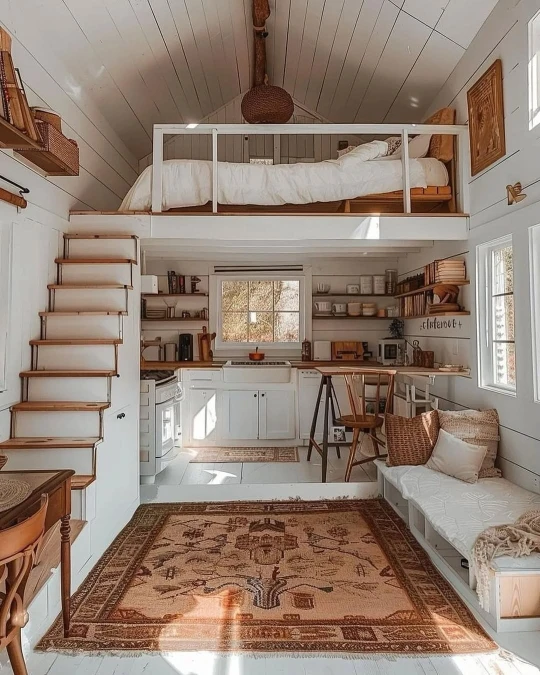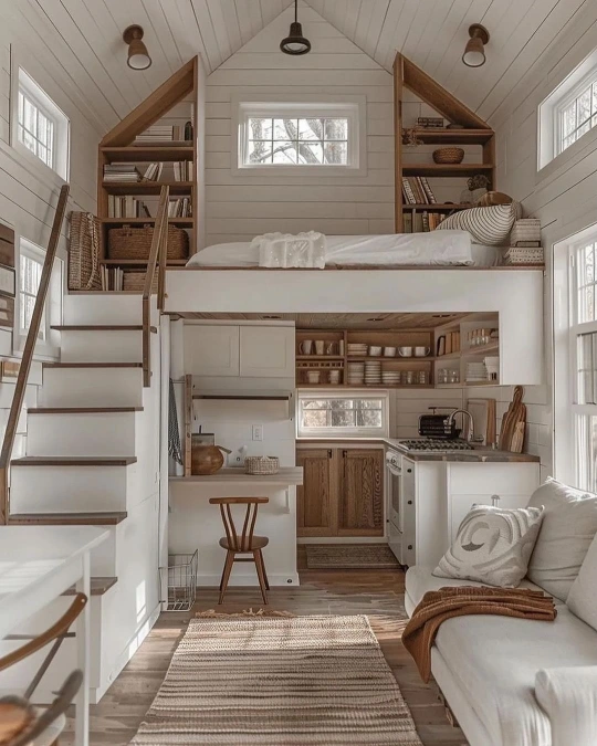 White walls and abundant windows flood this small space with natural light. The sleeping area sits on a wooden platform overlooking the main room. This loft design keeps the interior feeling completely open.