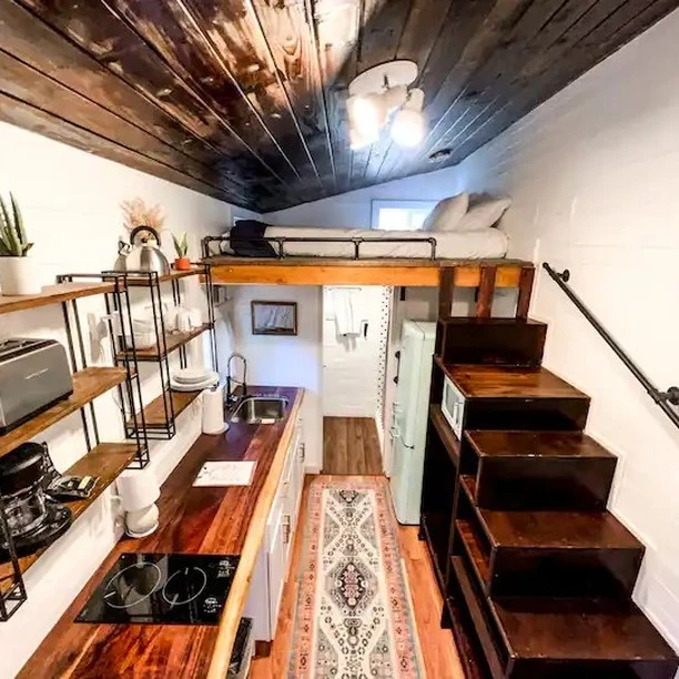 A small, comfy sectional sofa sits below the loft area. Wooden stairs with open risers lead up to the bed. The kitchen sits neatly behind the living space with butcher block counters.
