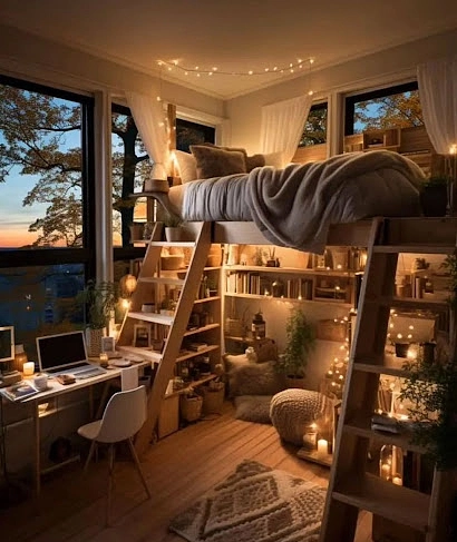 Natural wood floors and shelves create a warm, inviting atmosphere. The elevated bed enjoys commanding views through large corner windows. Delicate string lights illuminate the entire room with a soft glow.