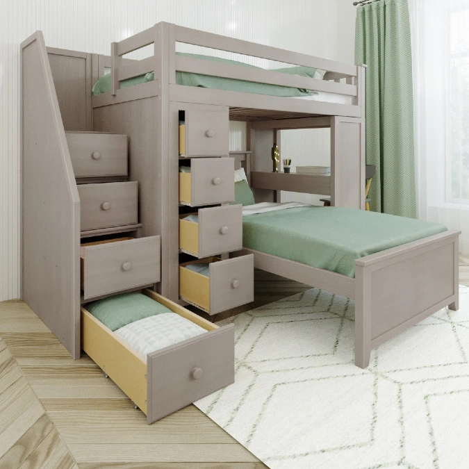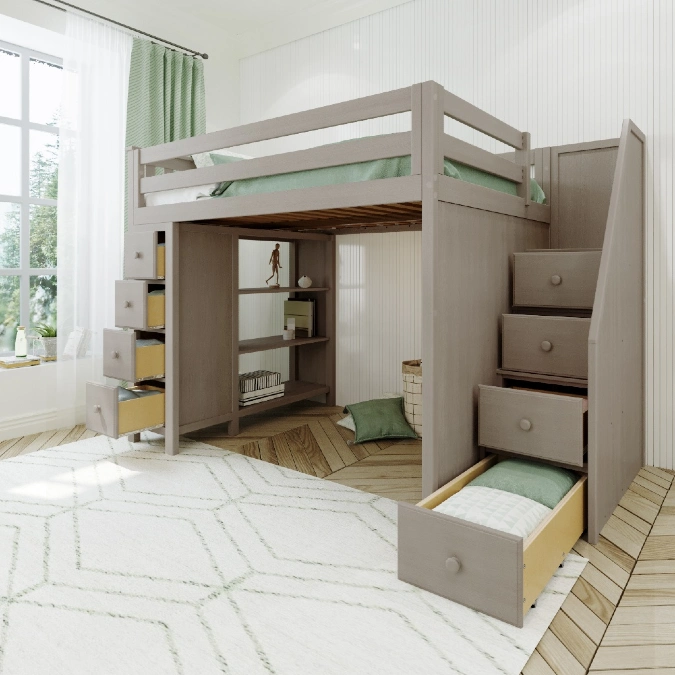 This massive loft unit provides ample space for sleeping and storage. The structure features a subtle taupe finish and sturdy rails. Both the entry stairs and the loft base include large, deep drawers.