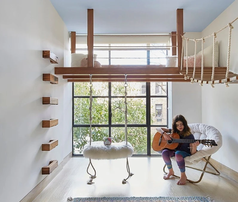 A large industrial window lets in abundant natural light. Below the loft, a circular swing adds a whimsical element to the room. The girl plays guitar while sitting in a cozy, modern chair.