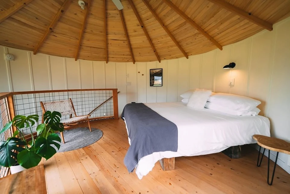 This unique interior features a circular room with a striking wood plank dome ceiling. Natural wood floors cover the entire elevated sleeping area. A king size bed sits directly on the floor without a frame.