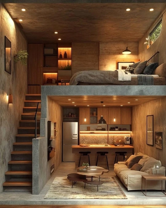 The loft bed sits directly above the galley kitchen with a simple metal railing. Wooden stairs ascend the raw concrete wall leading up to the sleeping area. A cozy seating area and round coffee tables occupy the front of the space.