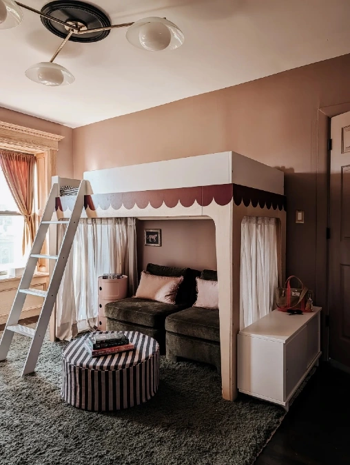 A playful, custom built wooden bed platform dominates this room. The elevated space features a scalloped trim painted in deep burgundy and white. Curtains hang from the loft frame, creating a private den below.