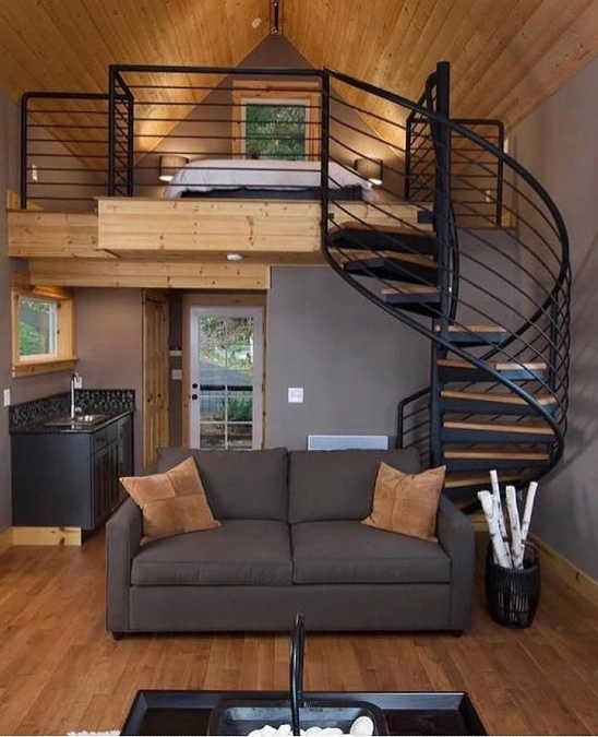 Rich wood floors and a vaulted ceiling give this cabin a warm, inviting feel. A black spiral staircase dominates the room, leading up to the sleeping platform. The loft has a black metal railing that keeps the space open and airy.