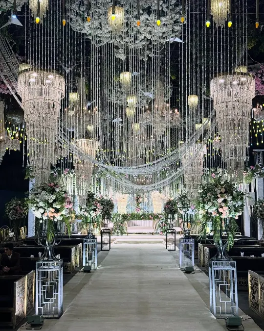 Grand crystal chandeliers hang from the ceiling to create a luxurious atmosphere. Strands of beads drape across the room to catch the light beautifully.