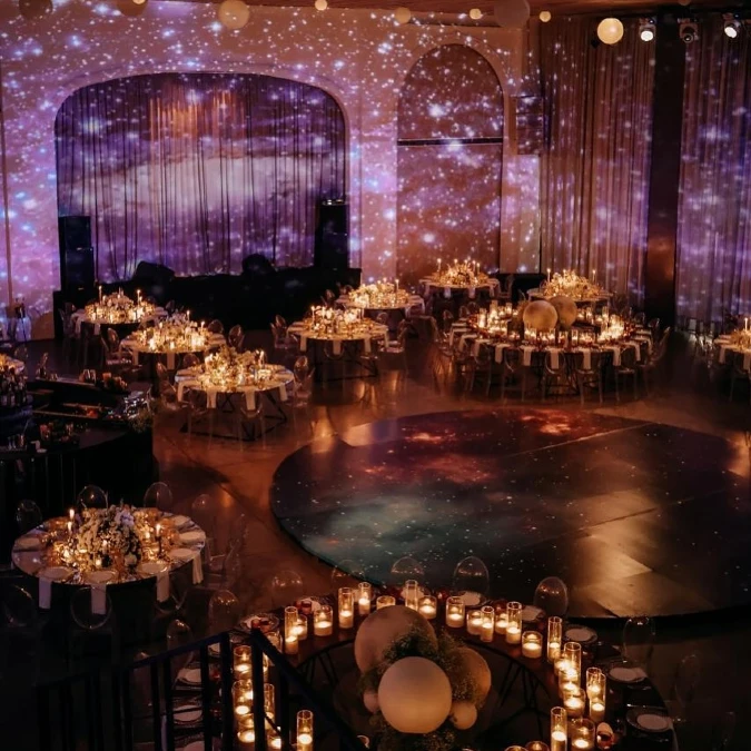 Vibrant galaxy projections transform the walls into a cosmic display of purple and blue stars. A circular dance floor reflects these celestial patterns to ground the outer space theme.