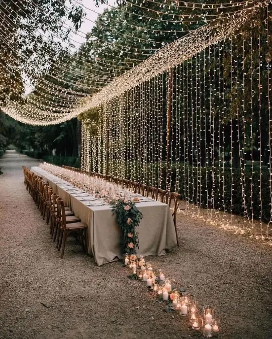 Vertical strings of warm fairy lights create a shimmering wall behind the dining area. An overhead canopy of glowing bulbs spans the entire length of the outdoor table.