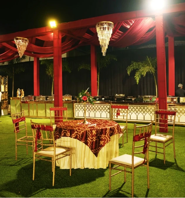Gold chairs with matching red sashes surround tables on a lush green lawn. A long buffet station with decorative latticework sits ready for the evening meal.