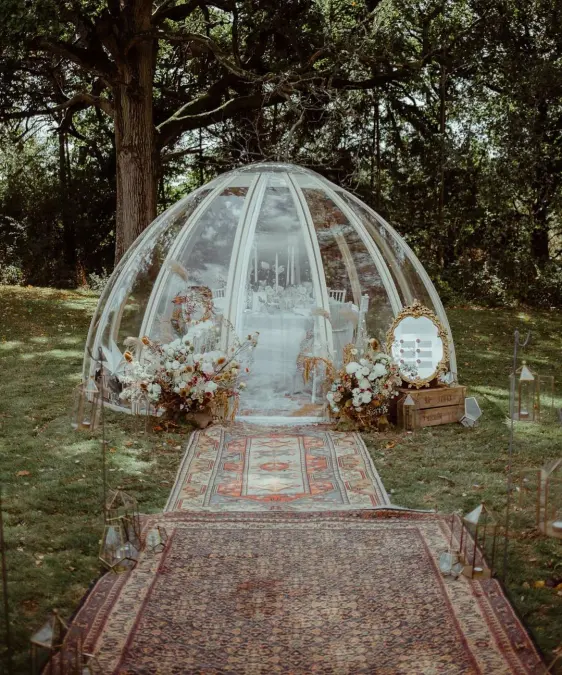 A clear glass dome sits nestled among tall trees for a private dining experience. Ornate rugs lead the way across the grass to this intimate garden sanctuary.